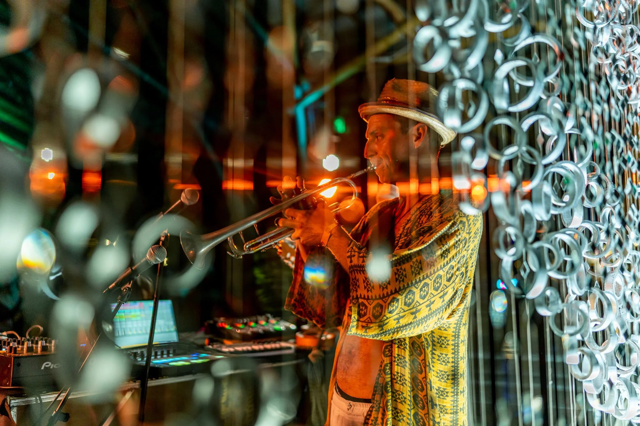 Afro/latin house or globally-influenced downtempo DJ set with live percussion and trumpet